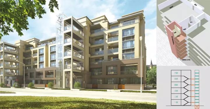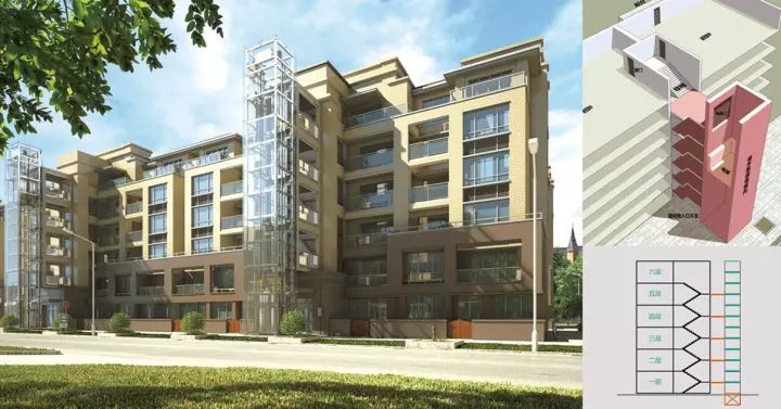 樓梯轉(zhuǎn)角處上下打通并重新改造成旋轉(zhuǎn)樓梯銜接上下層樓梯,電梯轎廂設(shè)置在室內(nèi)休息平臺空間,直接到達(dá)目的樓層。
