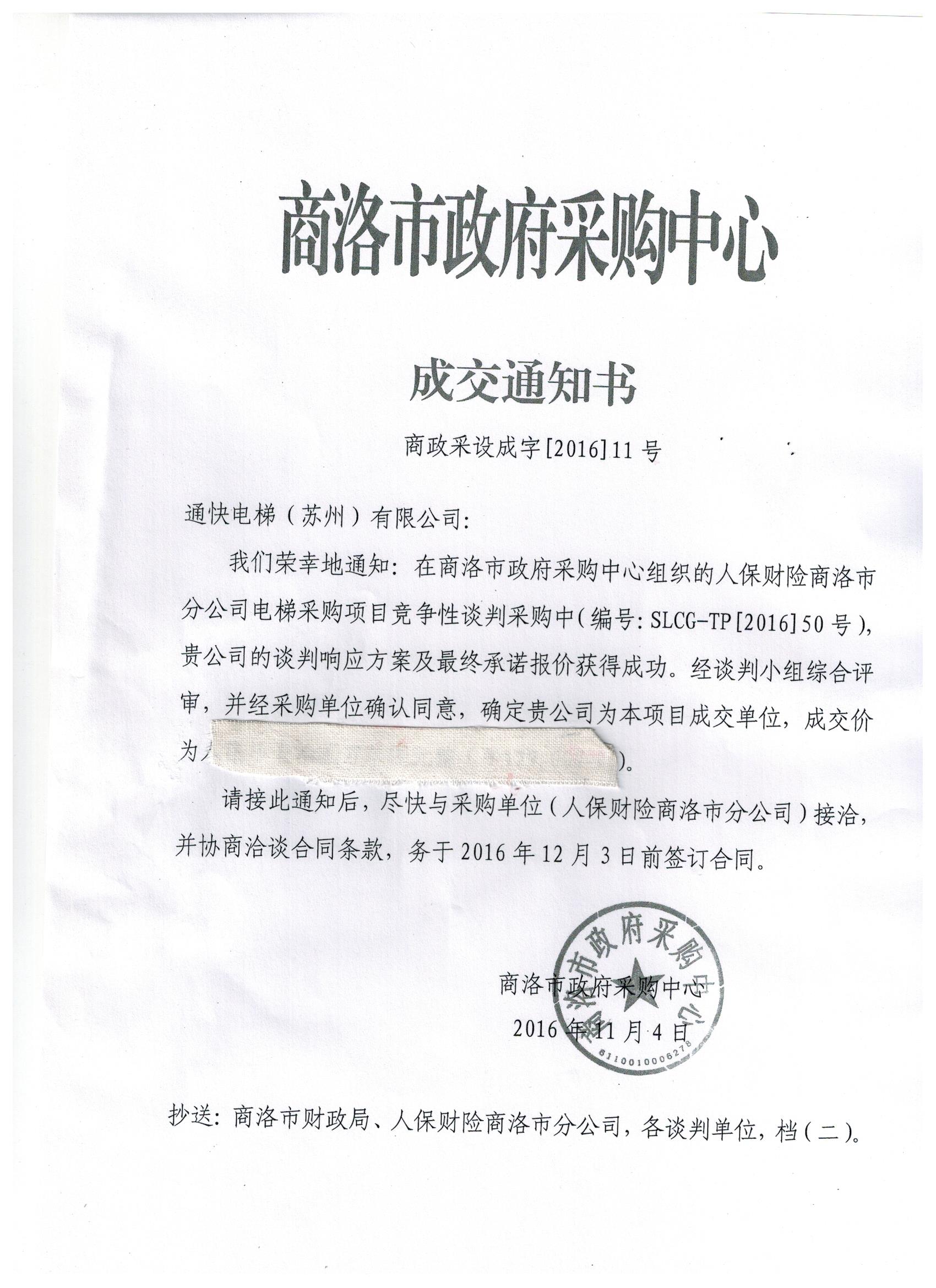 通快電梯(蘇州)有限公司中標(biāo)人保財險商洛分公司電梯項目